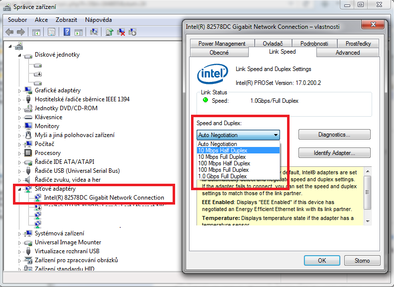 Mám to nastavené na "Auto Negotiation". Zkusil jsem to dát na 1.0gbps a internet přestal jít úplně. Tak jsem to vrátil na původní hodnoty. Bohužel náhradní kabel teď nemám.Zítra koupím nový kabel a zkusím to znovu.