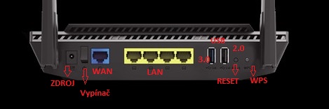 Všechny přípojné body a ovládací prvky jsou na zadní straně routeru:
