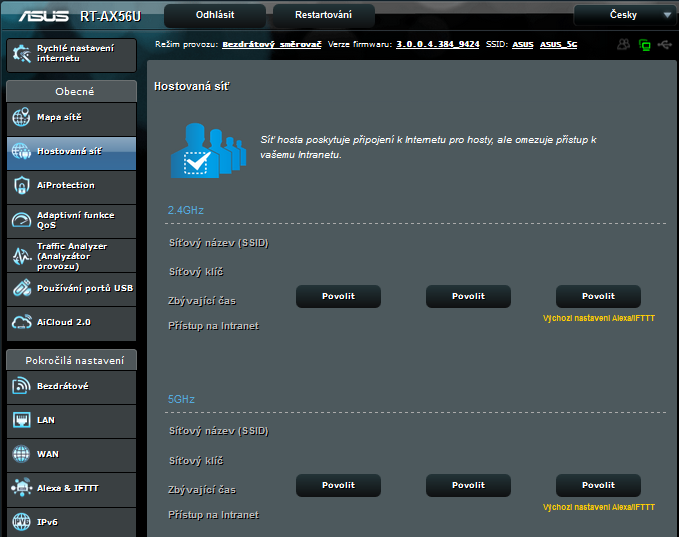 Hostovaná síť - umožňuje až 6 hostovaných WiFi sítí. Hostovaná síť znamená, že zařízení připojená k této síti mají přístup k internetu, ale už ne k síťovým prostředkům (počítače, tiskárny, sdílení).