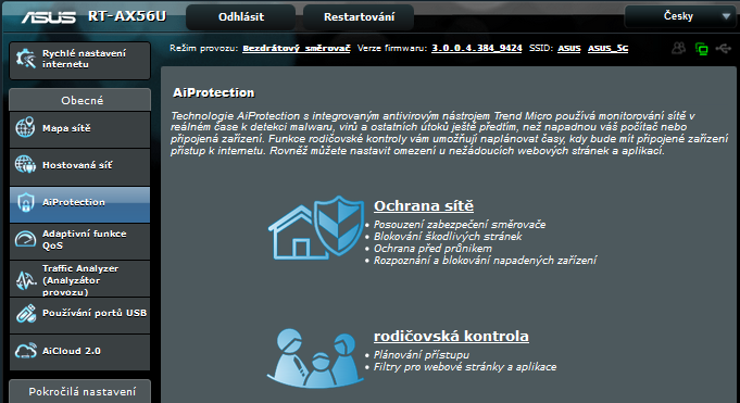 AiProtection - chrání vaši síť před průniky, blokuje nebezpečné stránky, rozpozná napadená zařízení v síti. V této položce najdete i rodičovskou kontrolu.