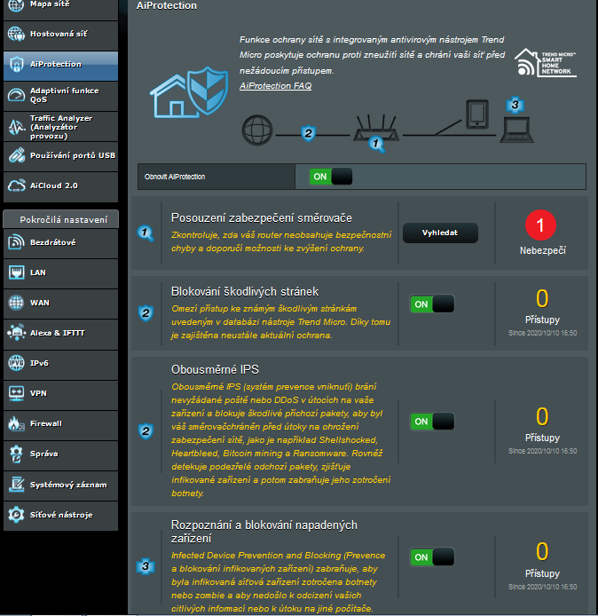 Router má vestavěný antivirový nástroj TrendMicro. Potenciální hrozby vyhodnocuje s TrendMicro databází.