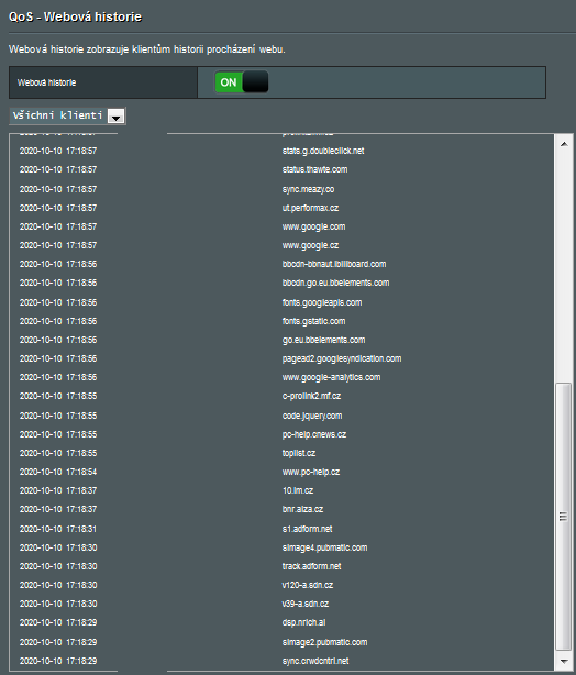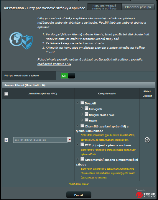 Rodičovská kontrola umožňuje omezit přístup k určitým internetovým stránkám a časové omezení přístupu k internetu. Stačí zadat MAC adresu určeného zařízení.