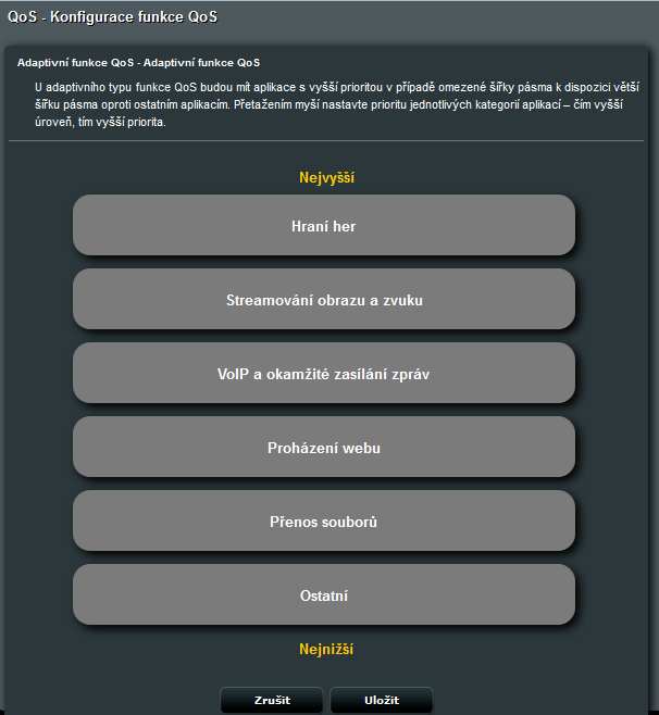 Při adaptivní volbě QoS si můžeme sami nastavit preferovaný druh paketů pouhým seřazením voleb: