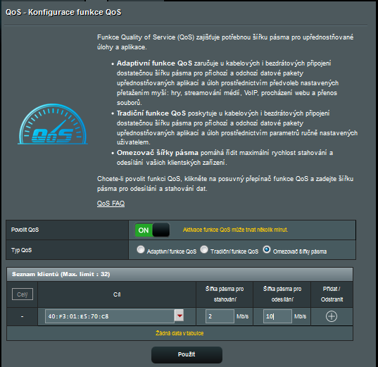 potřebujeme-li někomu omezit šířku pásma, postačí zadat MAC adresu jeho zařízení a vyplnit max. rychlosti připojení: