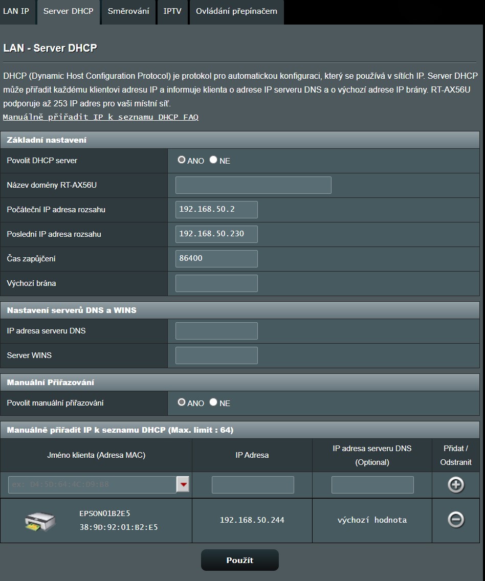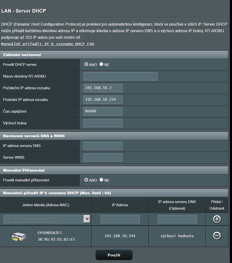A můžu nastavit pokud už mám teď připojená různá zařízení v rozsahu DHCP 192.168.50.2 - 192.168.50.230 a tiskárna je na 192.168.50.244 aby se ostatní zařízení neodpojila tak, že nechám počáteční 192.168.50.2 a konečný dám 192.168.50.230. A tiskárnu nechám 192.168.50.244 ( ta se neodpojí )? Nic jiného bych napevno nenastavoval než tu tiskárnu.