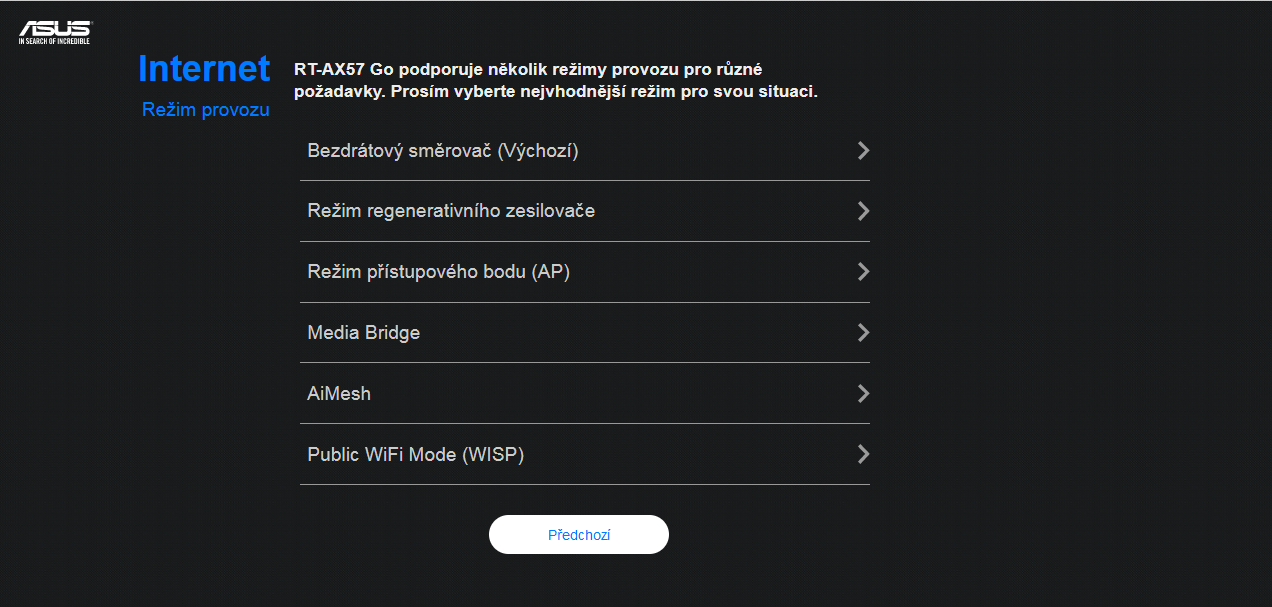 Jako obvykle jsem klikl na Pokročilá nastavení v domění, že se dostanu rovnou do nastavovacího rozhraní, ale nestalo se tak. Router zůstává v režimu průvodce, a postupně prochází jednotlivé body nastavení. Hned v dalším kroku si zvolíte režim provozu:
