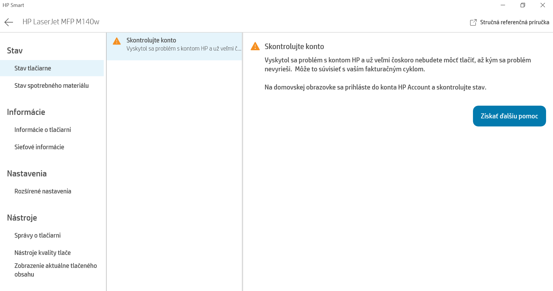 Mam tlaciaren HP LaserJet MFP M140w, ktoru som bezne pouzival a nebol s nou nejaky vacsi problem. V pondelok som tlacil nejake dokumenty, cca 1 list A4 za 20 minut. Vsetko fungovalo v poriadku, ale zrazu (bez vypnutia PC/tlaciarne/routera) zacal na tlaciarni blikat oranzovy vykricnik a prestala tlacit. Pise mi to, ze mam skontrolovat HP konto a tam sa dozviem viac. Bohuzial, HP konto mi ziadny KONKRETNY problem nevyhodi a ja vobec neviem, ako to riesit. (zakruzkovany oranzovy vykricnik blika)