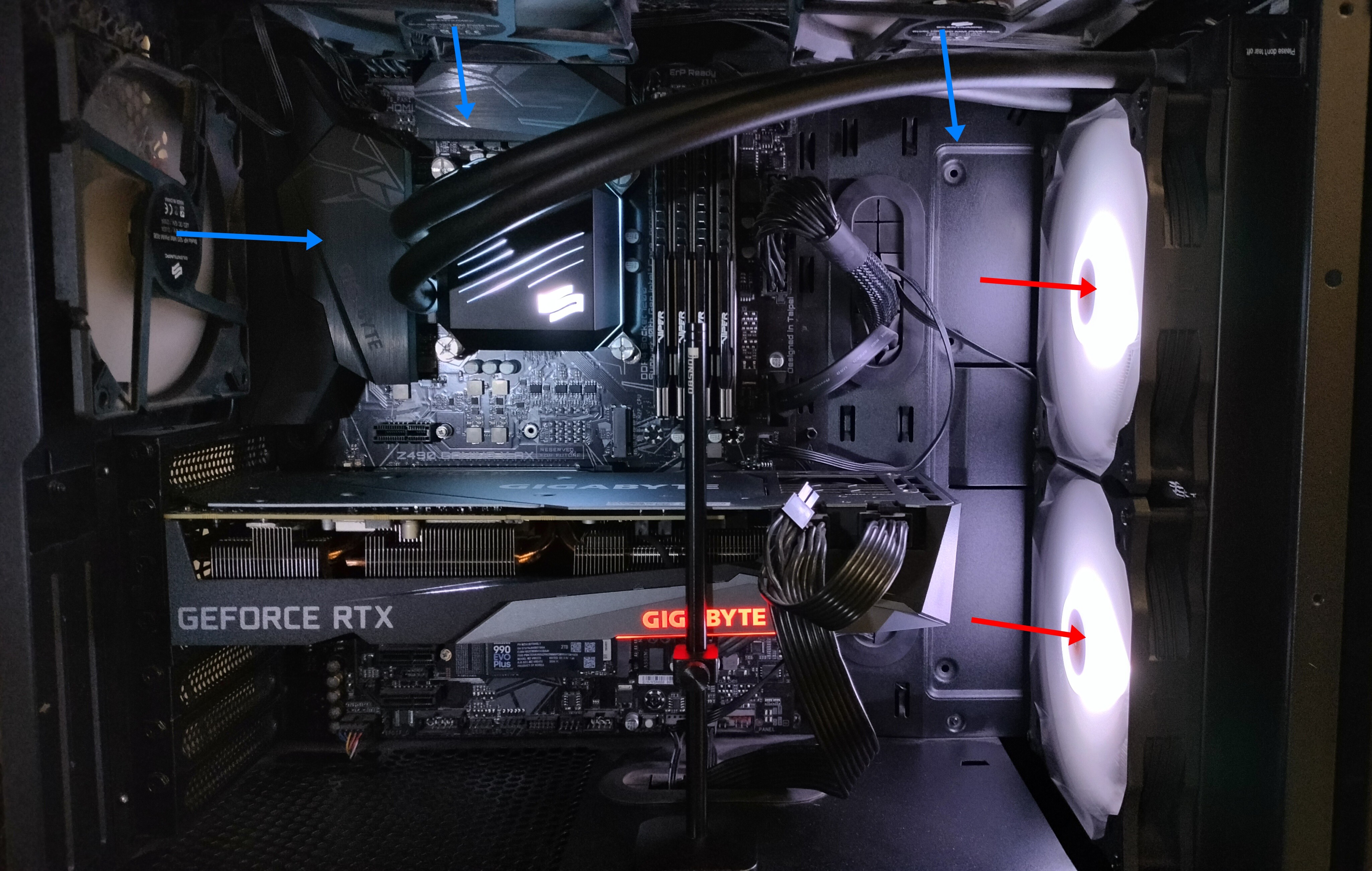 AiO může být vpředu, jen otočit radiátor "vzhůru nohama" (aby hadice ústily dole) i ventilátory, aby to natahovalo vzduch zvenku. Ostatní ventilátory otočit, aby směřovaly ven, viz: https://assets.corsair.com/image/upload ... rflow.webp