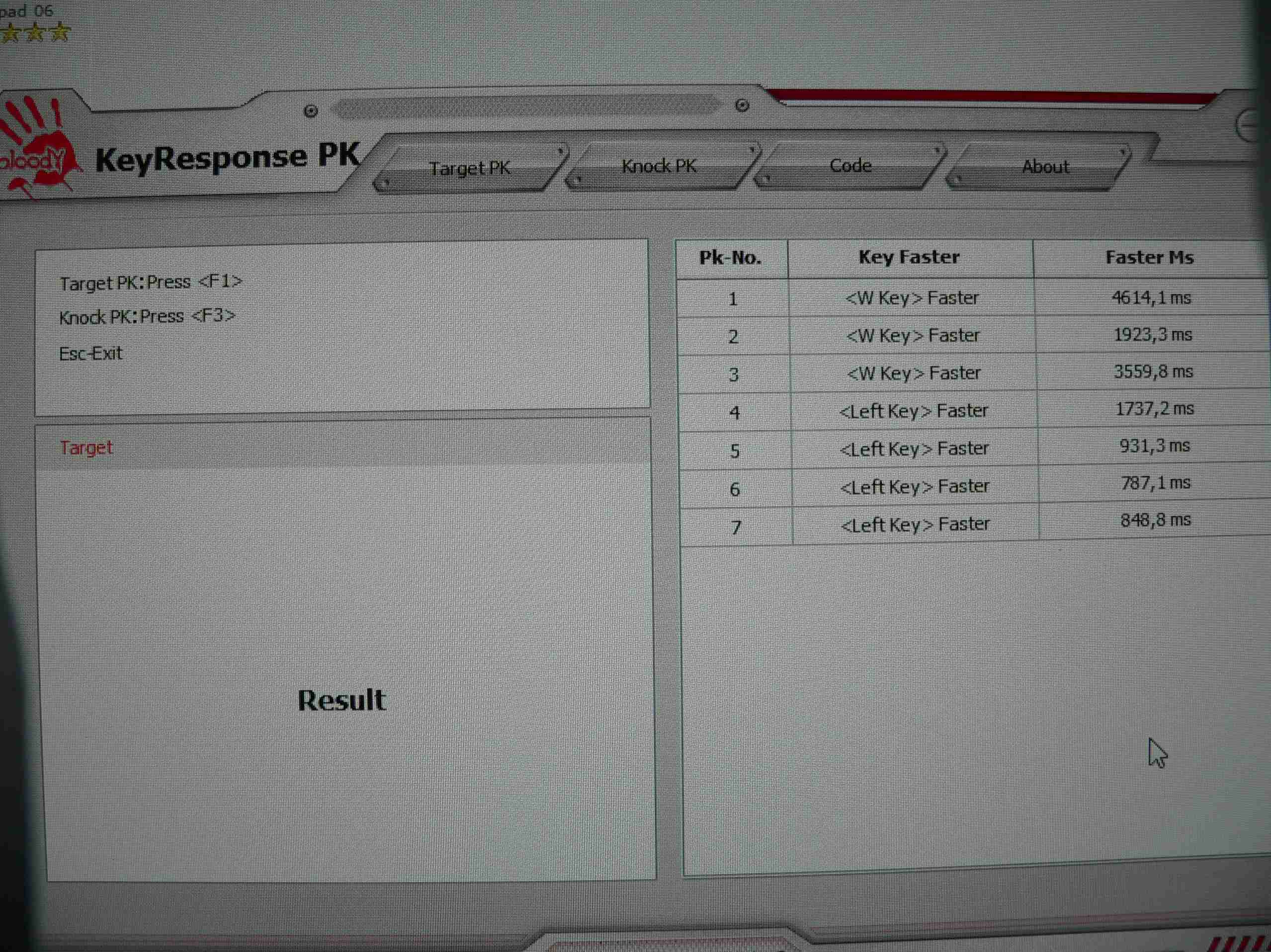 Key Response je na měření odezvy mezi dvěma kusy a to jak klávesnice tak myši a odpočítává se od šesti než se zobrazí terč.Udělal jsem si radost a vyměnil jsem deset let starý set,který vynechával a přikoupil jsem i klávesnici(celkově jsem dostal značnou slevu) a jsem v šoku jak je to všechno rychlé.https://www.bloody.com/en/product.php?pid=11&id=127