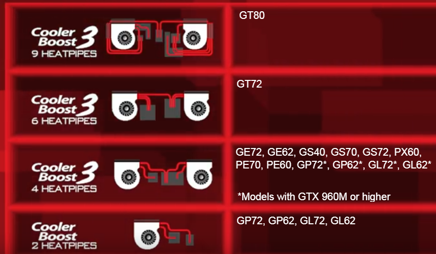 Většina těch videí je natočená tak, že nejde poznat co je to za model. Navíc ani jeden z těma teplotama není ten který doporučuješ (GP62M to jsou). Netvrdím, že se nadají u MSI najít dobré kousky, ale osobně bych se díval až v řadách GE a výše. U toho MSI GP62 7RD-028CZ se stačí podívat jen na fotky, že ten jeden výdech je zaslepen. Pak by měl obsahovat "Cooler Boost Technology", kdysi k tomu mělo MSI takovýto slajd: dnes už to pojmenovává jako 4. generaci, k té jsme nic nenašel, ale nepředpokládám, že by se děli nějaké zásadní změny...