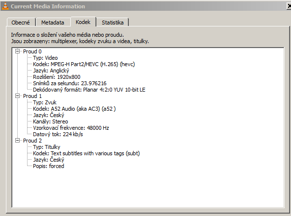 Na ntb Compag nc6320, Intel Core Duo T2500 2,0GHz, sleduju video H.265, 1920 x 800, 24snímků za sekundu, datový tok 224 kb/s, a je to tak na hranici výkonu. Procesor jede naplno, a občas se kousne obraz na malý okamžik a občas na chviličku vypadnou barvy. Ale je to v pohodě koukatelné.