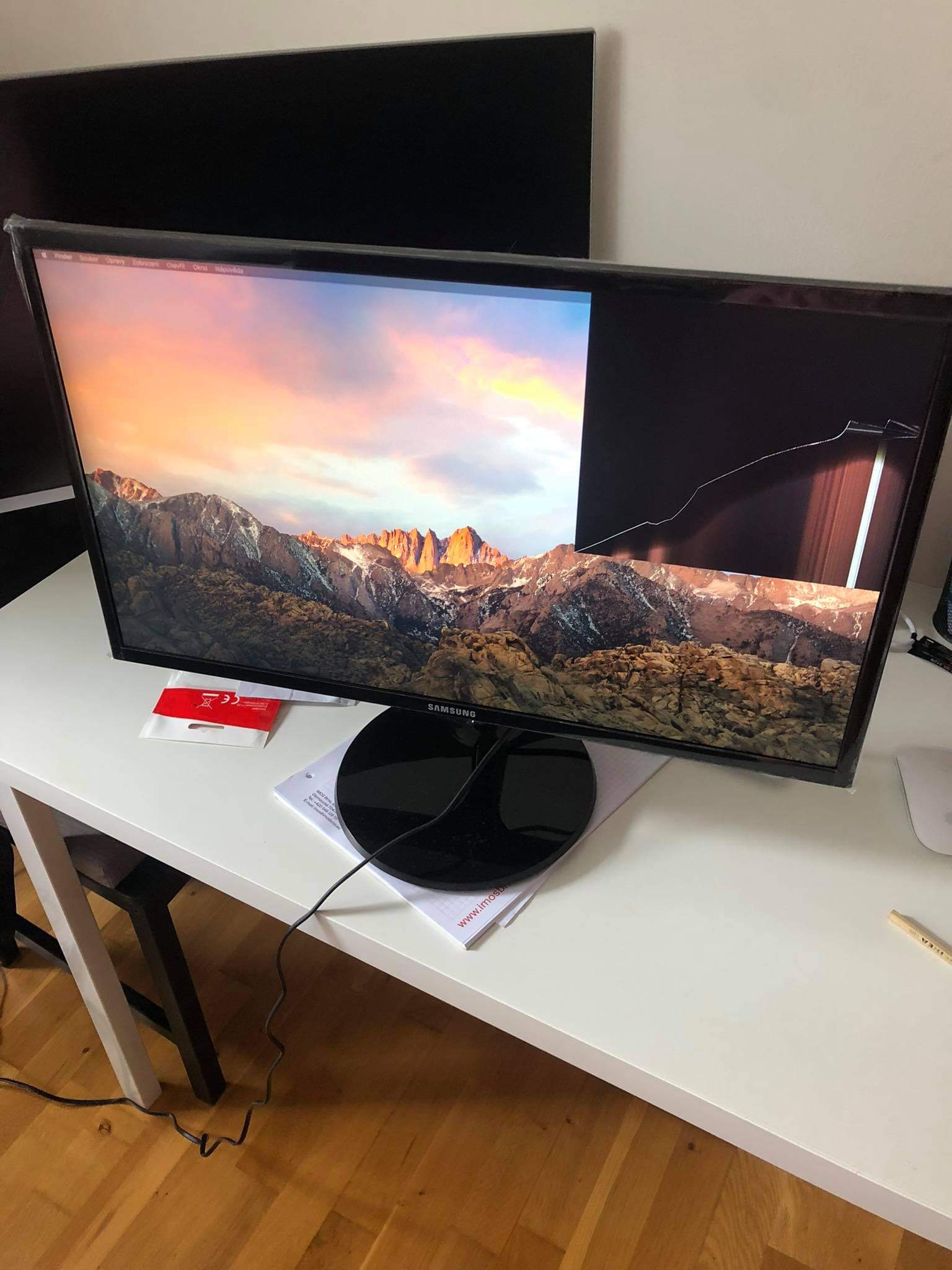 naša štvornohá mačka zhodila monitor, zvonku vyzerá ako nový ešte s ochrannou fóliou, po zapojení vidieť prasklinu (viď príloha).