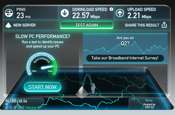 Jak jsem se ale díval a měřil rychlost stahování na stránkách www.speedtest.net, tak mi to ukazovalo download speed 22.57 Mb/s. (viz. obrázek)
