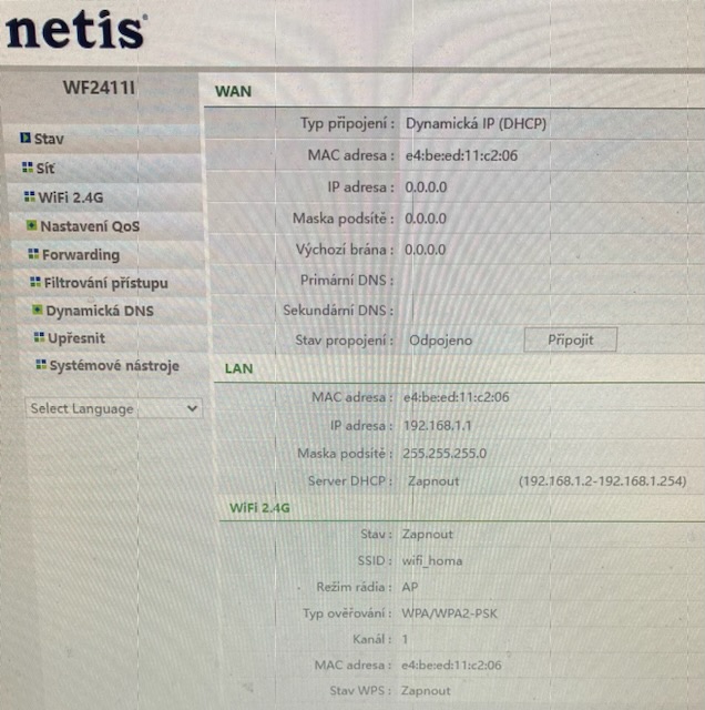 Na tom rozmazanem obrazku je videt, ze zarizeni neni pripojene do site p[oskytovatele, nema IP adresu pro WAN.