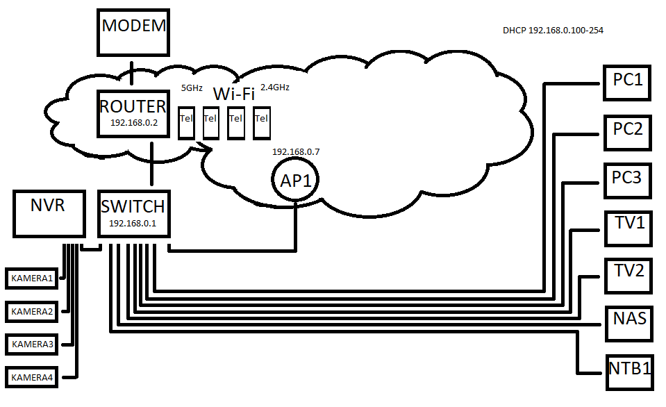 Router a AP vysílají jednu síť.