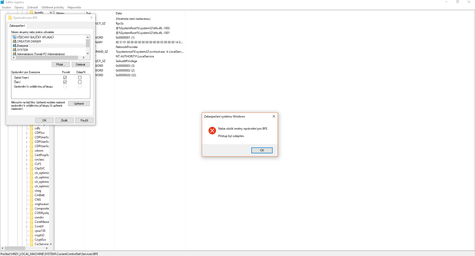 Protože je to úplně ten samej problém co mám já jenže když se dostanu Editoru registru a chci dát v oprávnění Everyone a povolit tomu ty "hlouposti" tak mi to napíše :"Nelze uložit změny oprávnění pro BFE. Přístup byl odepřen"