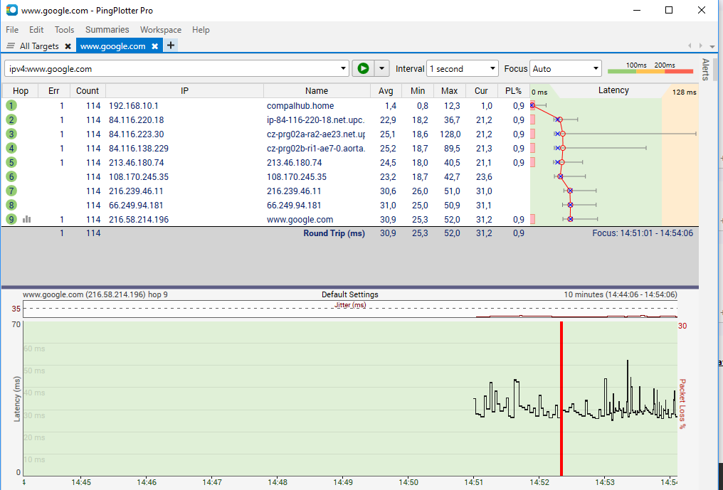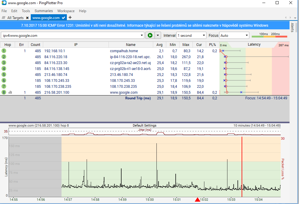 Ale máš chybu již někde u sebe - už tvůj router 192.168.10.1 má hrůzný ping (max. 80ms) a je tam i ztráta paketu. Pokud jsi připojen přes wifi, pak zkus kabel, zda se to nezlepší.
