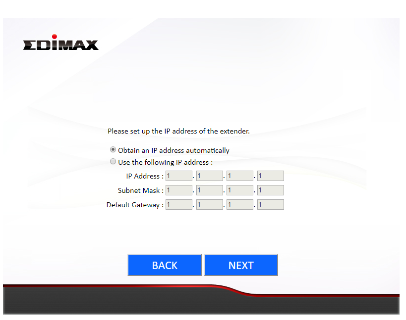 Instaluju podle manuálu extender HP-5101AC od edimaxu a doteď nebyl problém. Chce po mě nastavit IP adresu extenderu, v manuálu je doporučeno nechat zaškrtnutou první možnost.