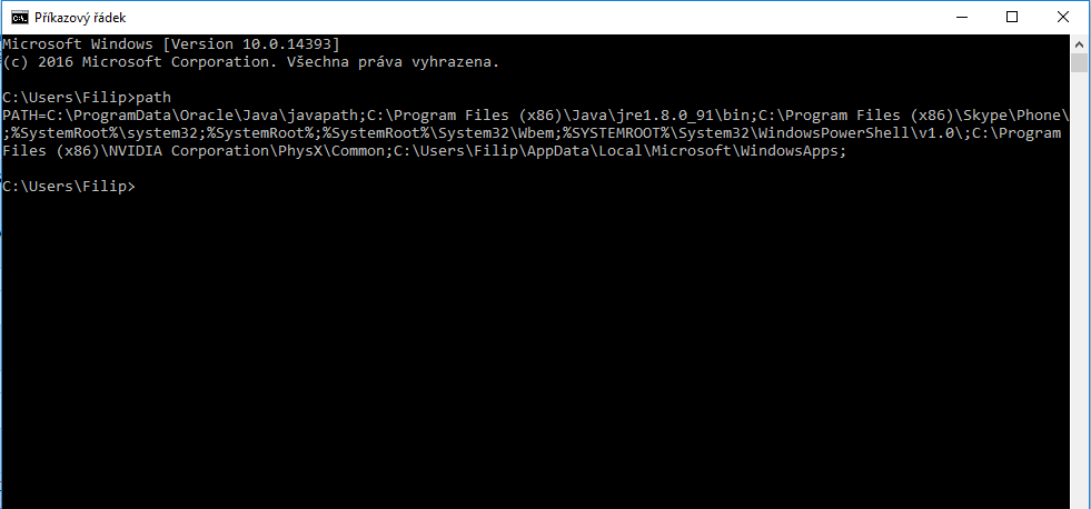 Spusť příkazový řádek. Zadej příkaz path . Vypíše se seznam cest zadaných v systému (odděleny středníky). Zkontroluj, zda je zde cesta