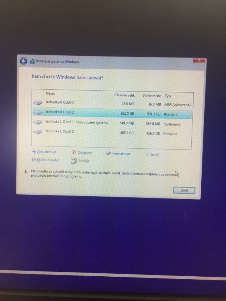 Když se ho pokusím nainstalovat na Jednotku 0 Oddíl 2, napíše mi to: "Nepovedlo se vytvořit nový oddíl nebo najít existující oddíl." Co mám dělat?