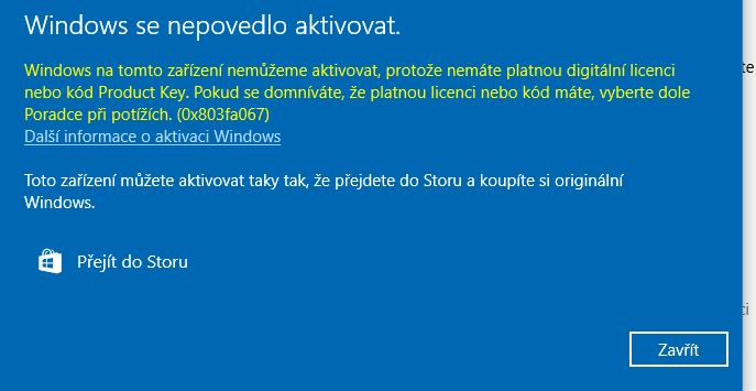 Při pokusu o aktivaci koupeným klíčem to hlásí jiný problém