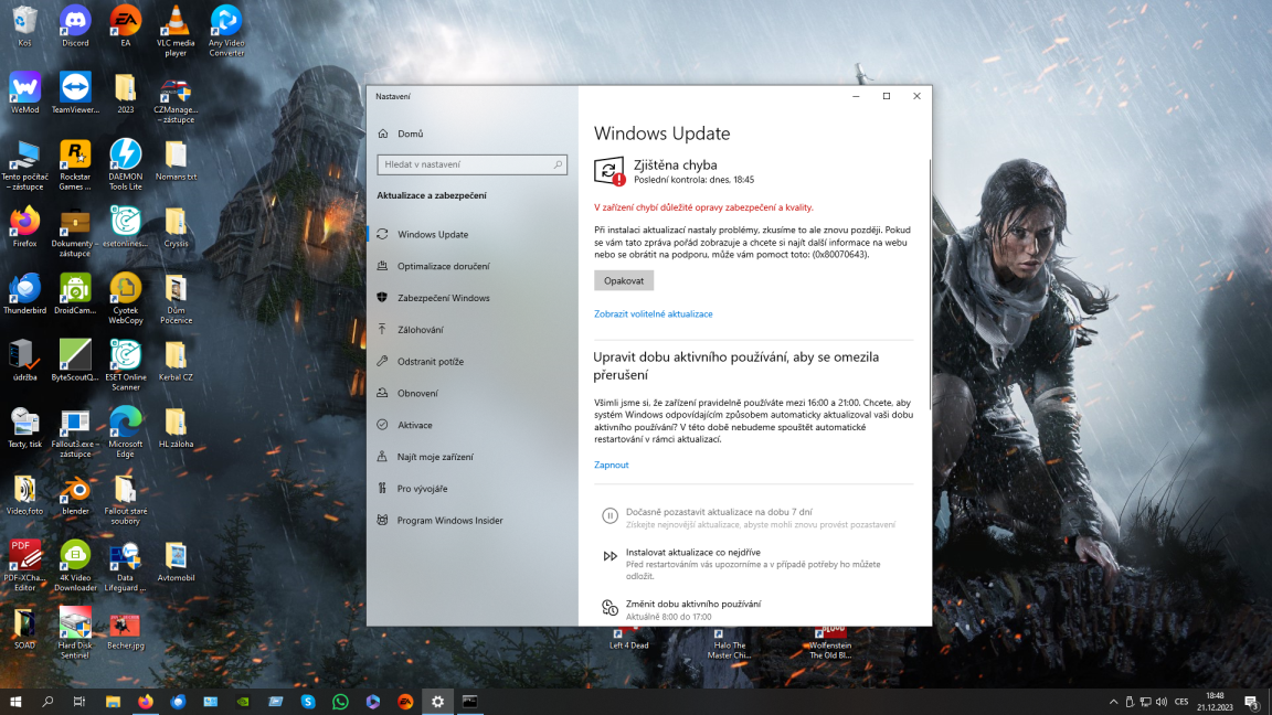 Když dám opakovat atd. tak mě to neustále hlásí chybu při stahování. (0x80070643/. Zkušel jsem hledat na netu, ale co jsem byl schopný udělat/většna je v angličtině, což zas tak nezvládám/ tak nic nepomohlo. Hlavní co jsem udělal byl SCF Scan /prý chyby opraveny / a vrátil smazané složky/což bylo spíše ze zoufalství/.Pak také opravu v