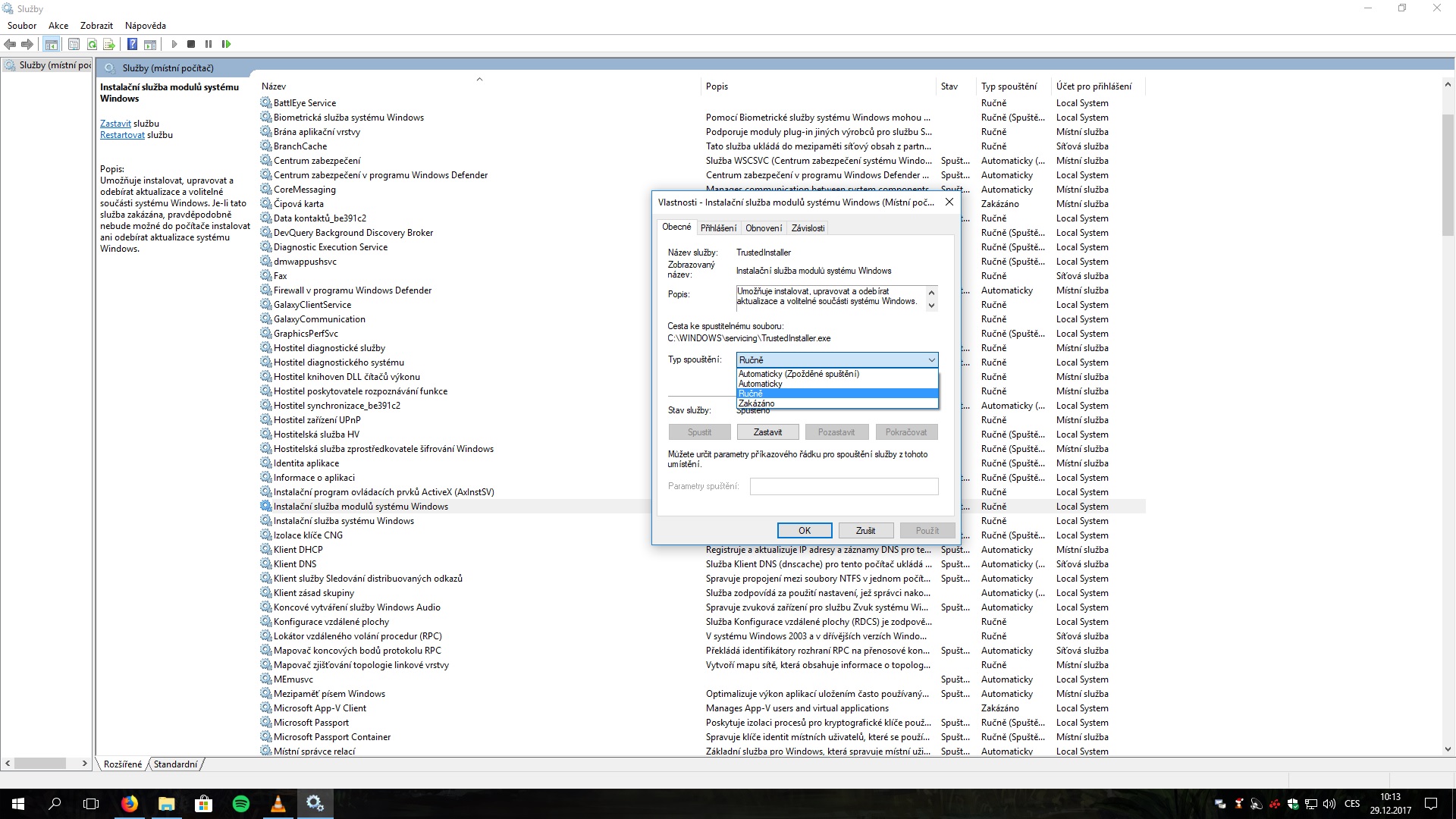 V té tabulce si najdi službu Instalační služba modulů systému Windows - běž pravoklikem do Vlastností a zkontroluj, jestli je není služba vypnutá. Měla by být nastavena na Ručně, pokud není přepni to na ručně a potom zkontroluj Stav služby, musí být Spuštěno.