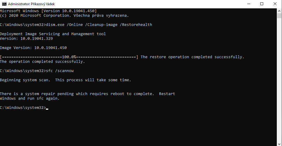 Okay, tak ještě před instalací těch čistých W10 provedu příkaz dism.exe /Online /Cleanup-image /Restorehealth, uvidím, jaký bude výsledek. Po něm teda ještě dám příkaz sfc /scannow a taky počkám na výsledek. Ideálně to pak printscreen-nu a pošlu vám to tady.
