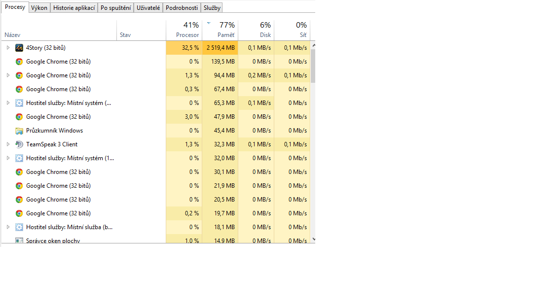 Až k tomu opět dojde, udělej screenshot správce úloh, záložky Procesy, procesy srovnané podle využití paměti, od max po min a hoď ho sem.