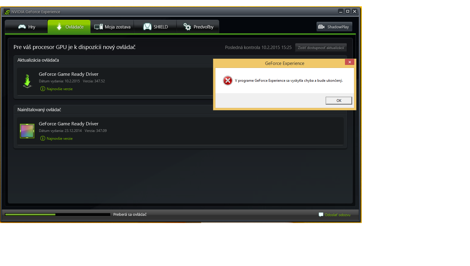 som preinstaloval a vložil staršiu verziu a stále mi to tu chyby ukazuje "v programe GeForce Experience sa vyskitla chyba a bude ukončený. " neviem aktualizovať program+grafický ovladač...