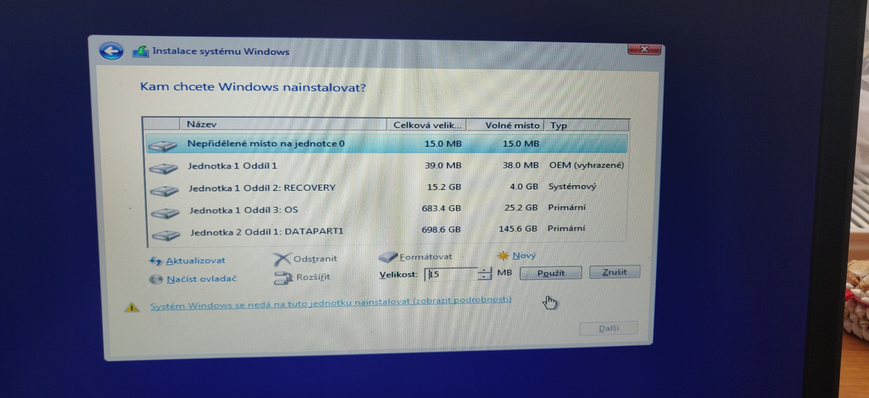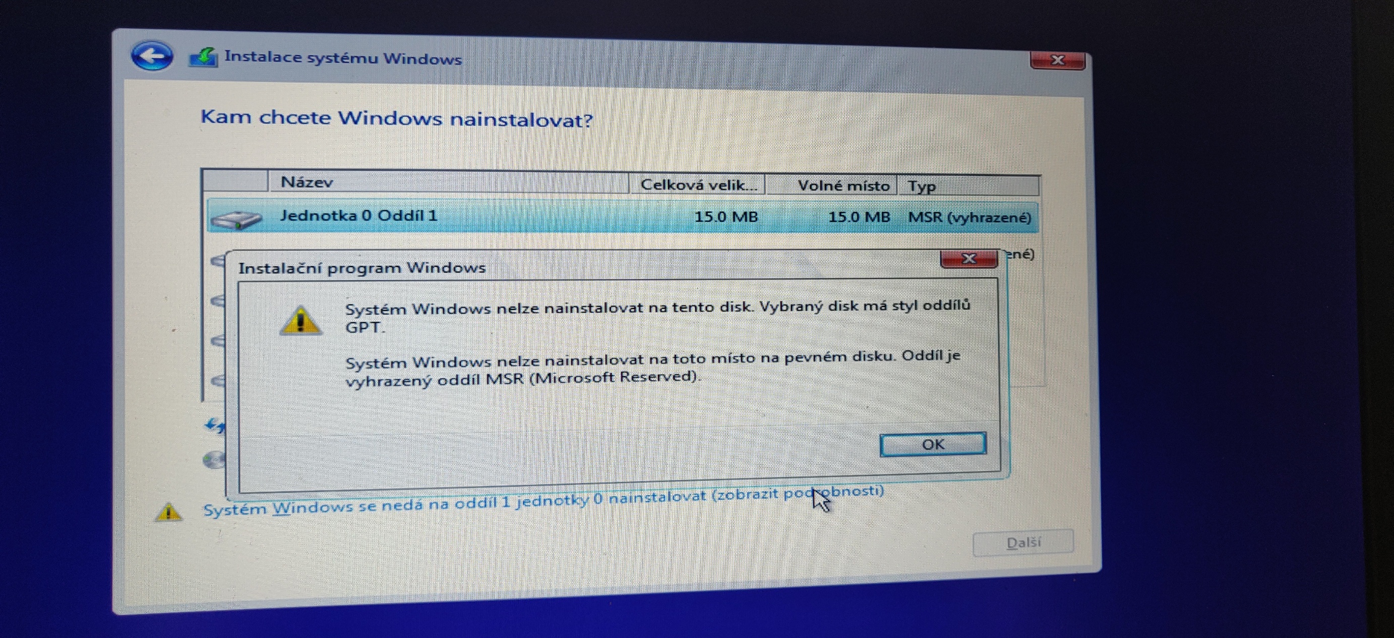 Pokusil jsem tedy nainstalovat win na oddíl 0 poté to ohlásilo že má špatný typ oddílu tak jsem ho změnil ve správci disků ale problém přetrval má někdo nápad?