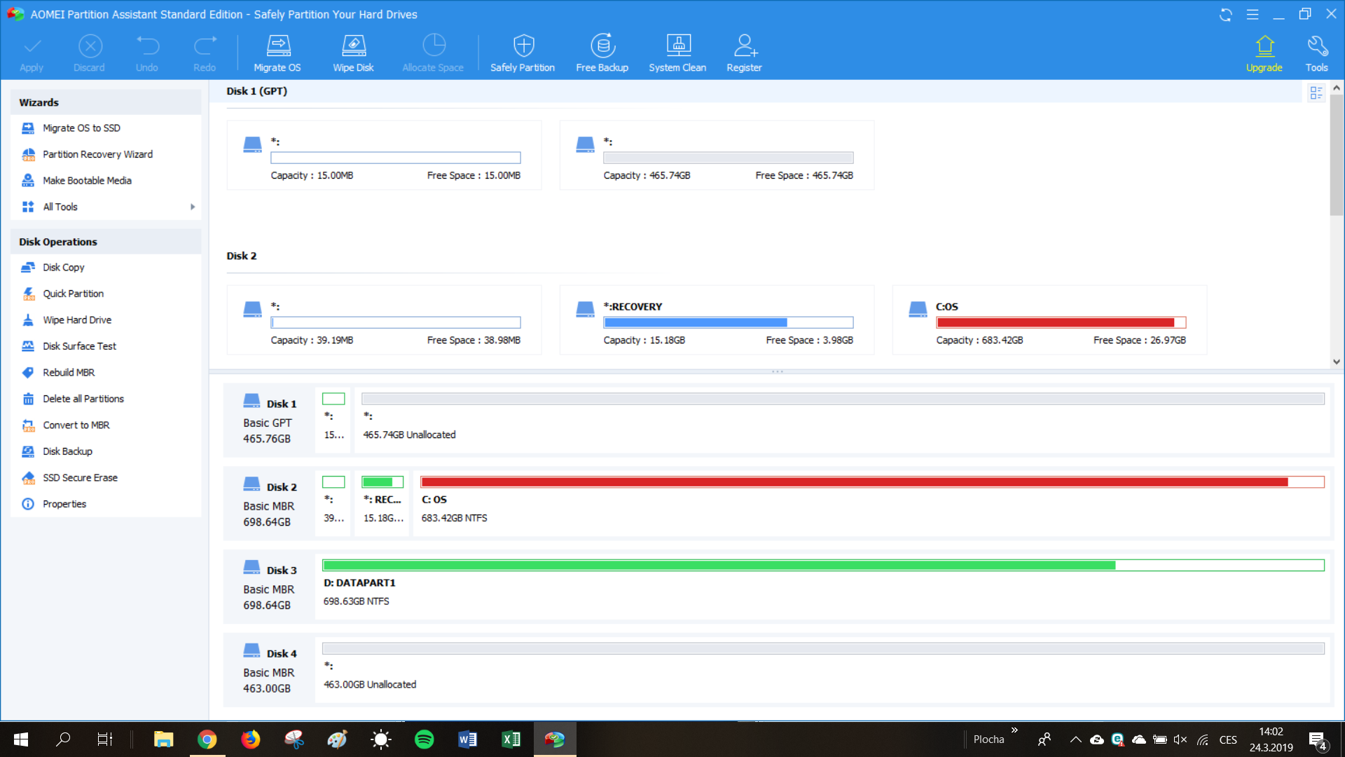Klikni si PT na označenie Disk 1 a vyber si Delete all Partitions potom hore vľavo na Apply , či to prebehne.