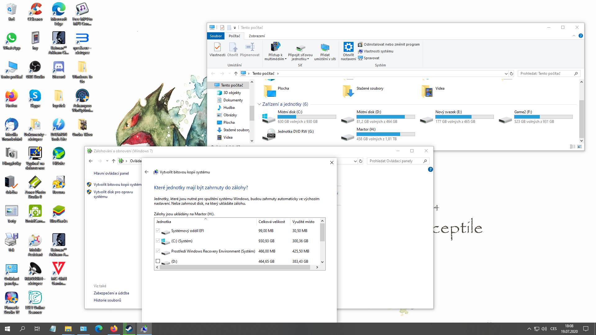 RIKI22 Ten Disk 1 -sám nevím kde se to vzalo.Asi při nějaké obnově dříve, už dávno a nechávám to, zatím, tak.Ten mám rozdělený na D: a E:.Někdy to opravím. Ten mi ale problém nedělá. Když chci dělat tu bitovou kopii, tak se mi tam natvrdo zahrnuje Disk F: /Viz.druhý obrázek/Tedy to chce dělat zálohu C: /což potřebuji a navíc i F: /což nechci/.