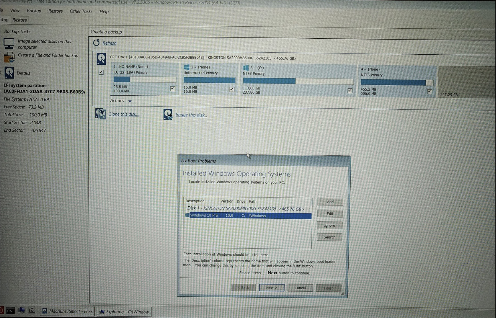 Přikládám screen z Macria, co ukazuje strukturu nového SSD, a log z pokusu Win o opravu.