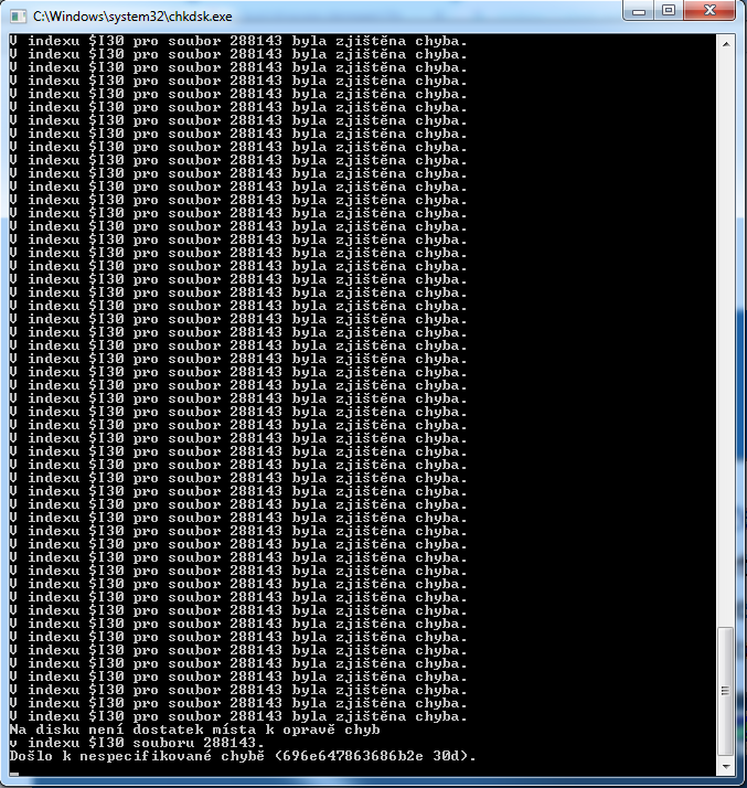 Když chkdsk sputím z příkazového řádku, tak to skončí touhel chybou: Má někdo nějakou radu, co zkusit ? (budu vděčnej za každej nápad..než strávím půl dne googlením..)