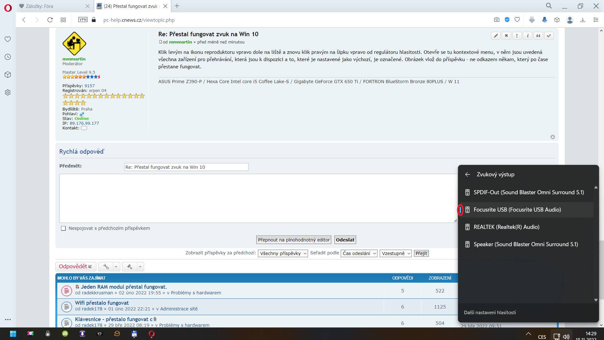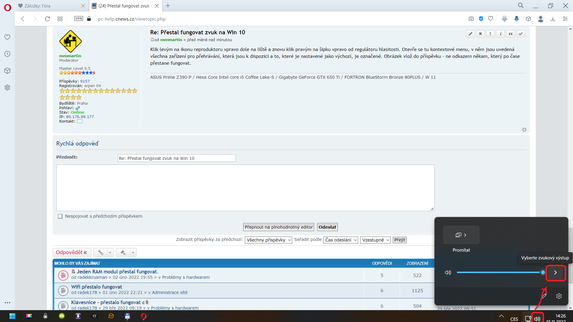 Klik levým na ikonu reproduktoru vpravo dole na liště a znovu klik pravým na šipku vpravo od regulátoru hlasitosti. Otevře se tu kontextové menu, v něm jsou uvedená všechna zařízení pro přehrávání, která jsou k dispozici a to, které je nastavené jako výchozí, je označené. Obrázek vlož do příspěvku - ne odkazem někam, který po čase přestane fungovat.