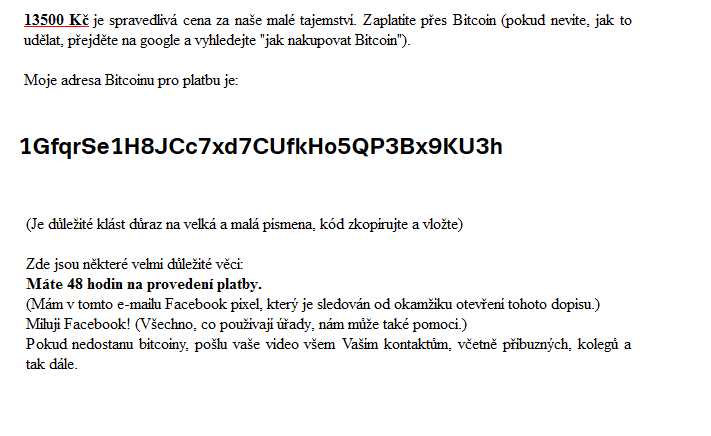 Také mi to samé nebo něco podobného nedávno přišlo a samozřejmě neberu to vážně. Tyto nebo podobné e-maily se šíří už nějakou delší dobu a divím se, že proti tomu se už něco neudělalo a nezastavilo se to. To snad policie má málo prostředků na to aby s tím něco udělali nebo nemá dostatečné odborníky na to aby toho nebo ty (pokud jich je více) lumpy vypátrali a zastavili je v tom? Je mi jasné, že pachatelé působí asi někde ze zahraničí a proto je tu kromě policie ČR ještě i nějaký Europol a Interpol nebo jak se to vše jmenuje. Ty peníze se mají posílat na nějaký bitcoinový účet a ten snad anonymní není a nebo by šlo snad vysledovat kde ty Bitcoiny odtamtud putují dál. Asi je to mnohem složitější než si mnozí myslíme.