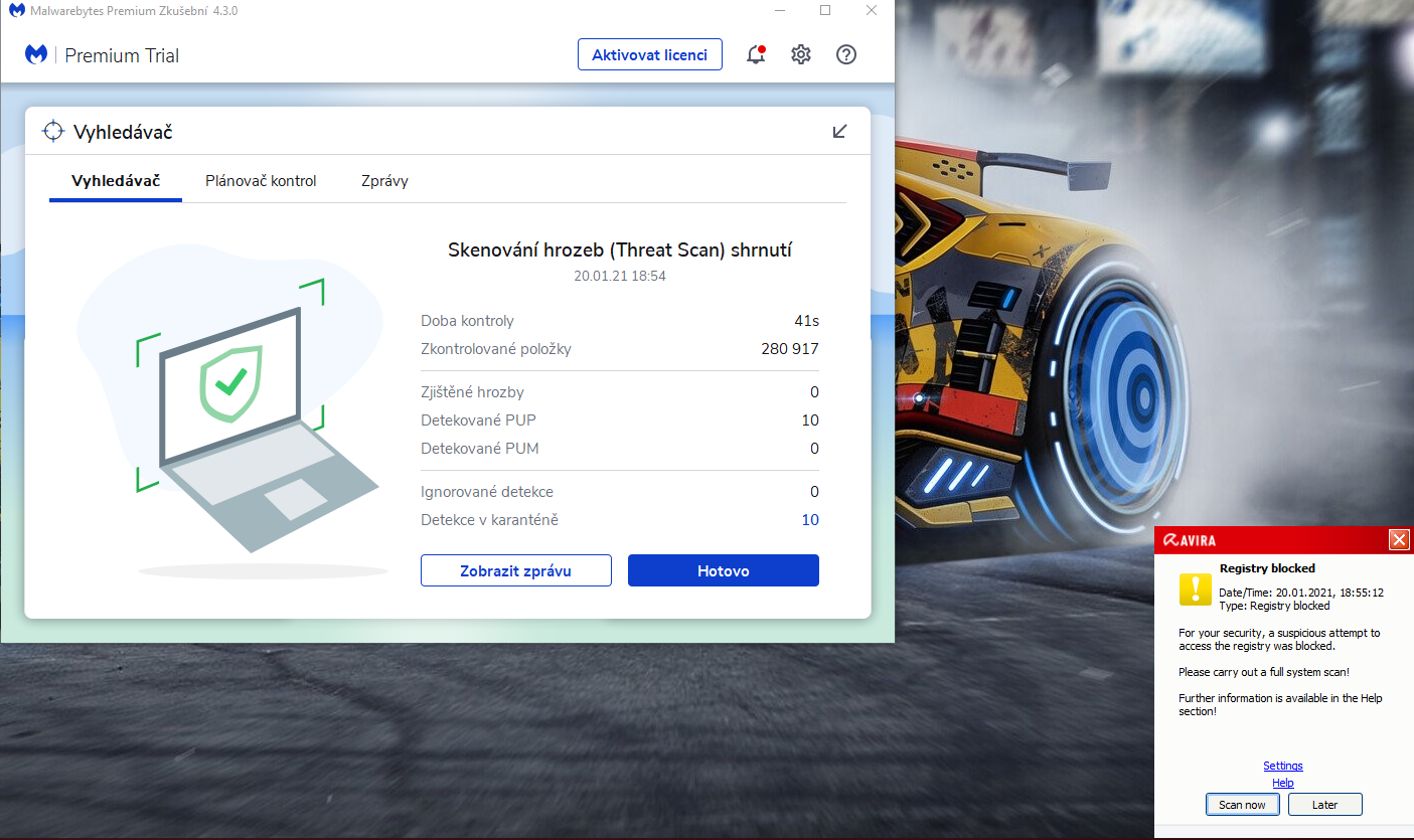 Zdravím, měl jsem tu nedávno příspěvek v hijackthis a bylo mi doporučeno ať si malwarebytes nechám v PC. To mi ale při každém skenu najde 10 stejný položek, hodím to do karantény a něco mi začne blokovat Avira antivirus. Viz. zde: