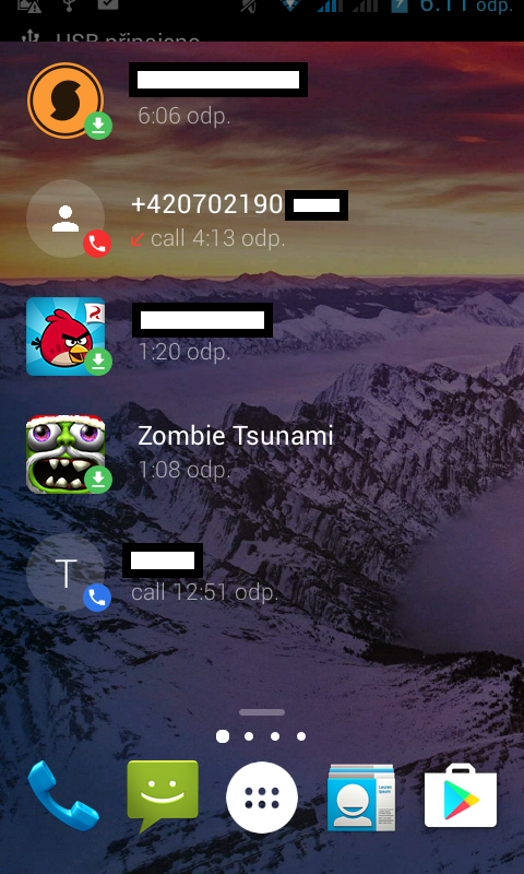 Na ostaních plochách (ty už jsou vedle sebe) vidíte např. historii hovorů a historii stažených aplikací a miniatury nedávných screenshotů.