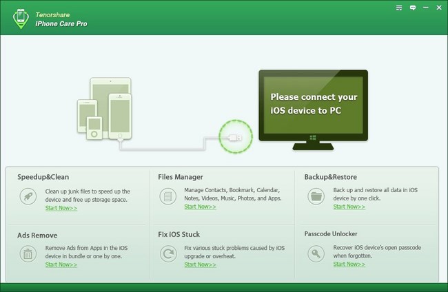 Tenorshare iPhone Care Pro je all-in-one nástroj pro optimalizaci vašich iOS zařízení. S ním, můžete použít buď Quick Clean nebo hluboké čištění pro odstranění všech nepotřebných souborů na iPhone / iPad / iPod, blokovat reklamy / bannery v aplikacích a opravit iOS přilepená způsobené iOS aktualizace, přehřátí, atd.
