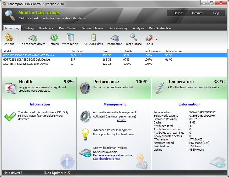 Ashampoo HDD Control je profesionální nástroj pro pokročilou diagnostiku a testování vlastností a výkonu pevných disků.