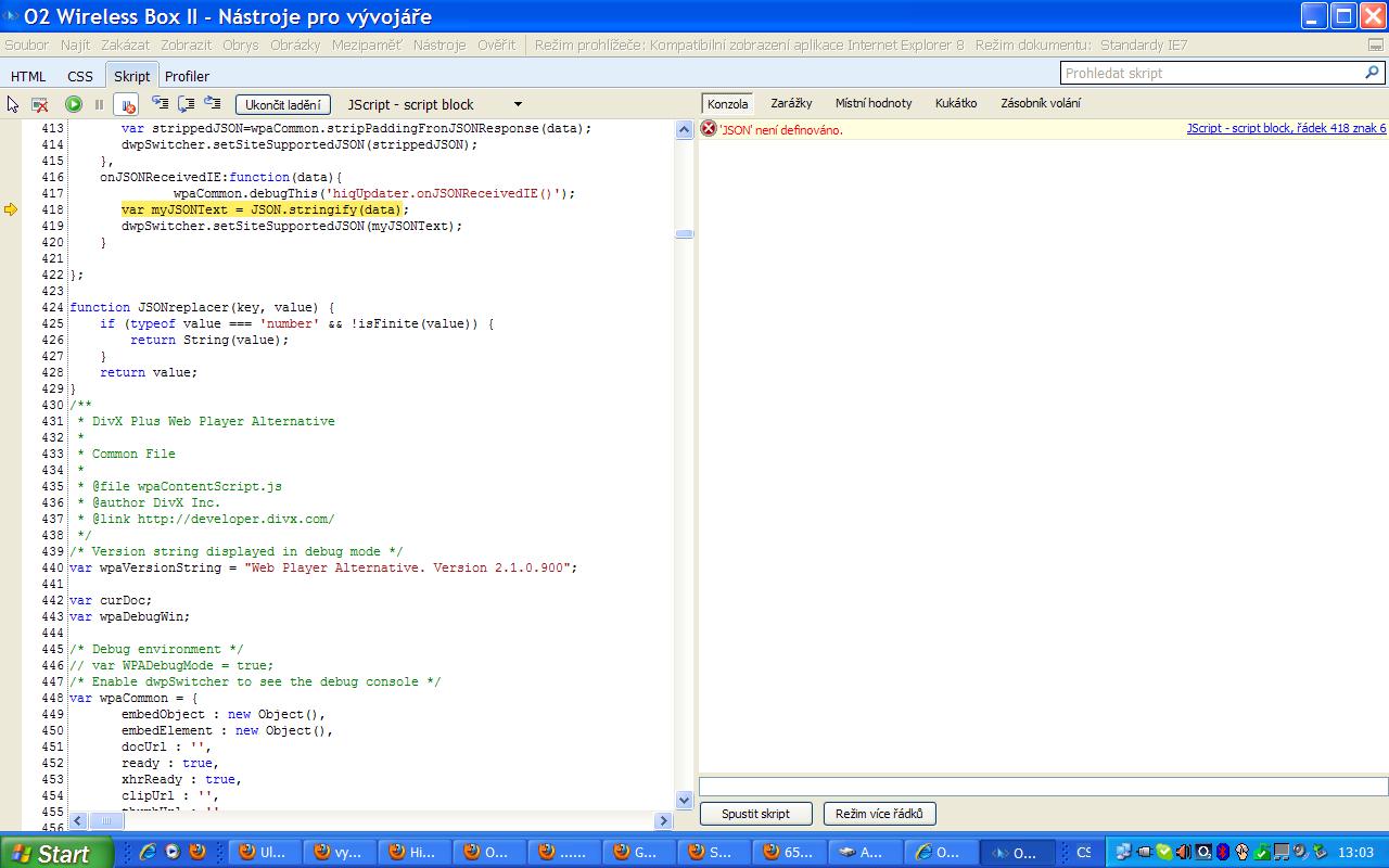 Vyskytl se mi problém; na webové stránce routeru, který začal ukazovat,že webová stránka, která se otevírá přes Explorer 8 obsahuje chybu takže nemusí správně pracovat.Ta chyba viz. okopírovaná příloha skriptování této stránky je, že není definován JSON.Jsem laik, ale rád bych, aby se ta chybová zpráva odstranila.Je nějaká rada či přímo pomoc jak?