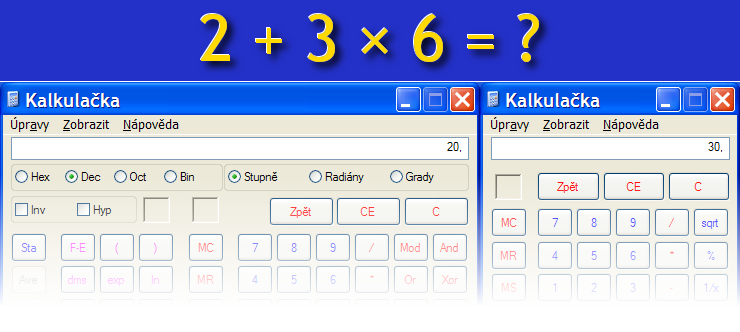 Chyba je způsobená tím že windowsí kalkulačka v základním režimu počítá jako nejobyčejnější dvouregistrová kalkulačka, co se prodává na trhu za 39 kaček, a tím pádem nedokáže pracovat víc než se dvěma čísly najednou. Vědecké kalkulačky mají tři nebo víc registrů, a proto zvládají dodržovat prioritu operací a případně i závorky. Mimochodem, i kalkulačky jsou počítače, i když jen se čtyřbitovým mikroprocesorem a několika kilobajty programové paměti, a počítají v desítkové soustavě, přesněji v kódu BCD.