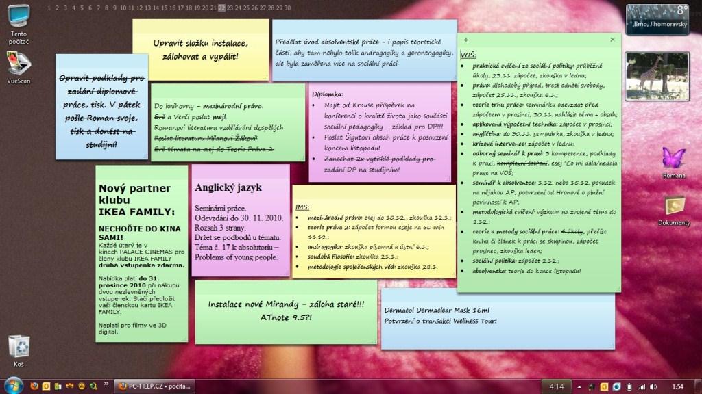 To jsou jen Sticky notes z W7. Jak sem je začala používat, tak jsem si děsně na to zvykla a zapomínám psát do diáře :) Ale lepící bločky mám i na korkové nástěnce.. prostě papírky, papírky, papírky, ...
