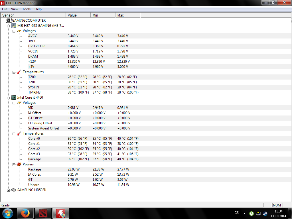 Mám podezření na zdroj, ale PC se i v zátěži nevypíná a funguje skvěle, takže si nejsem jistý. Tady je screen z HW Monitoru, v napájení mě znepokojuje hodnota 8V u +12V, ale stejná hodnota tam byla i předtím.