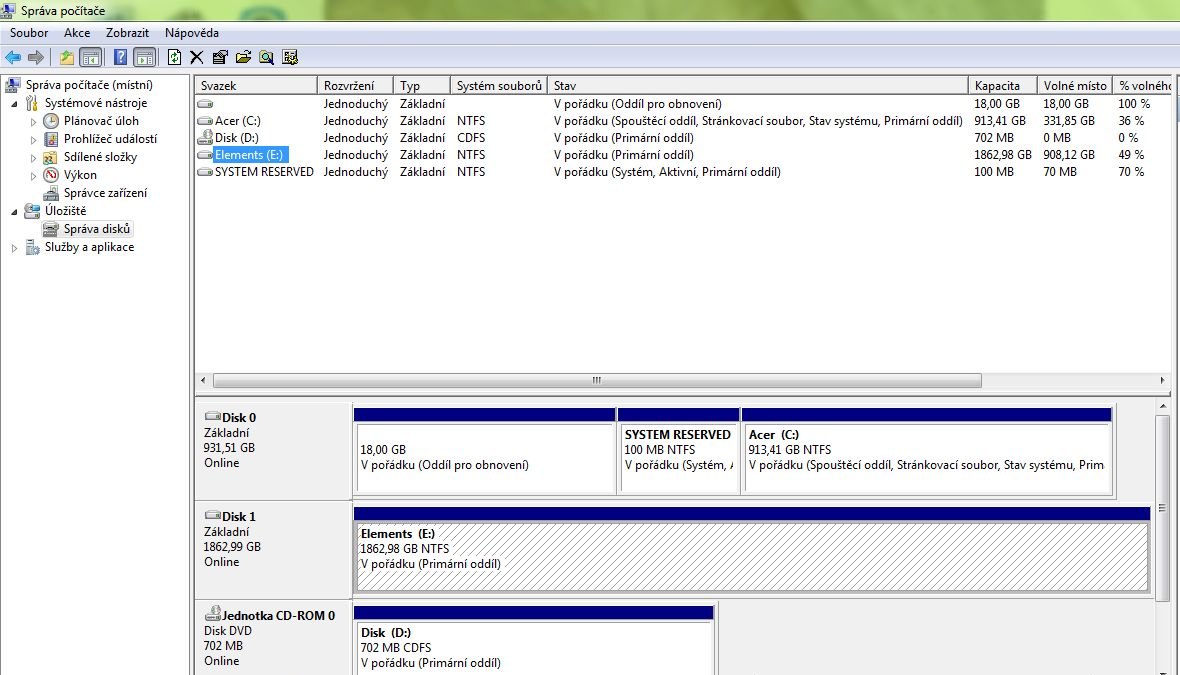 Toto ukazuje správa disků (snad jsem to dobře vyfotil, jiné info jsem tam nenašel)