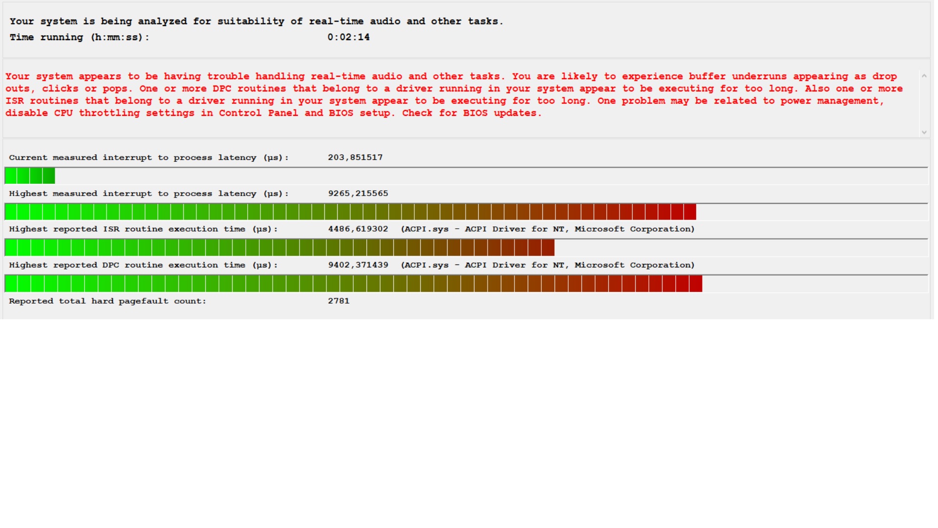 Your system appears to be having trouble handling real-time audio and other tasks. You are likely to experience buffer underruns appearing as drop outs, clicks or pops. One or more DPC routines that belong to a driver running in your system appear to be executing for too long. Also one or more ISR routines that belong to a driver running in your system appear to be executing for too long. One problem may be related to power management, disable CPU throttling settings in Control Panel and BIOS setup. Check for BIOS updatets.