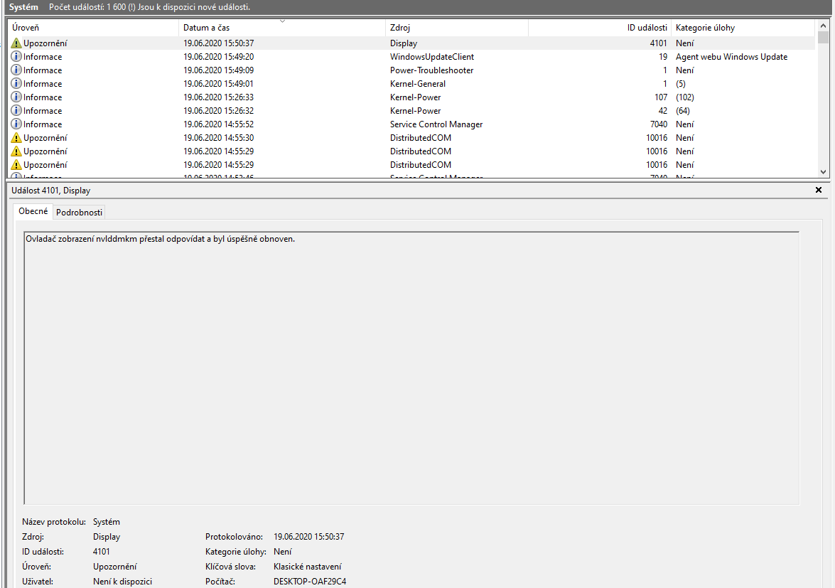 Když je chyba "display" tak problikne obrazovka do černa. Když "jen" DCOM tak je to to zamrznutí (a zvuk odpojení zařízení)