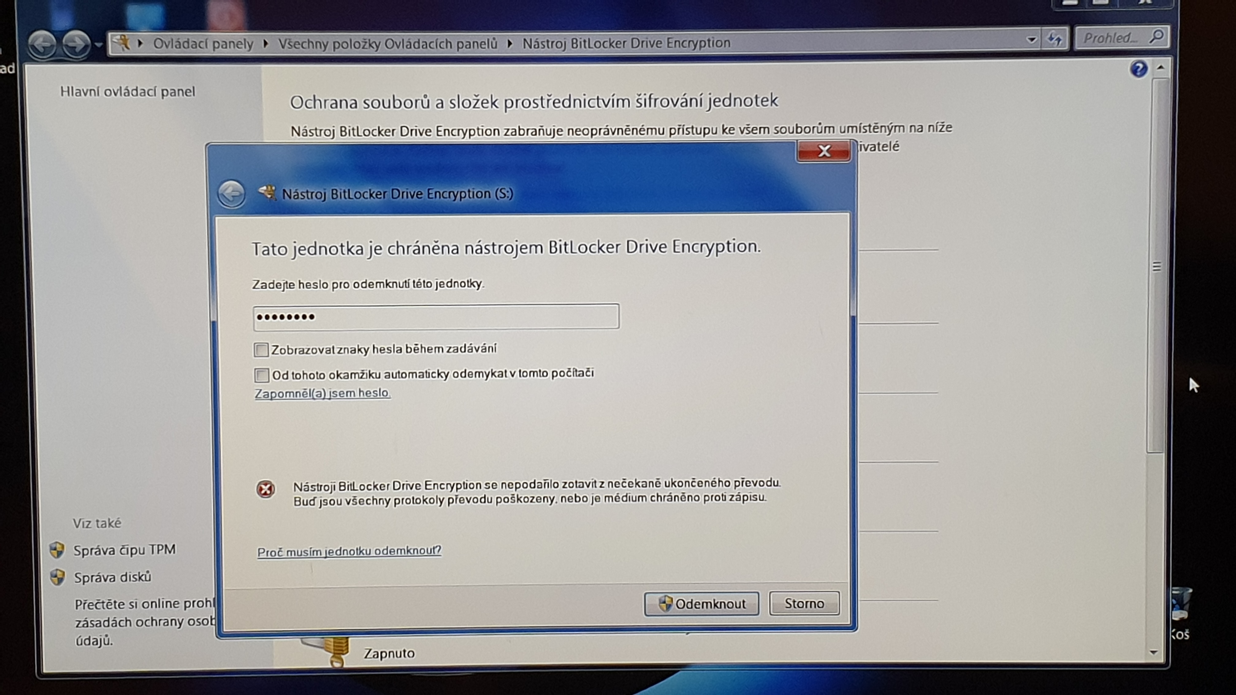 Kdyz sem dnes potreboval nake dokumenty z tohoto disku a zkusil disk odemknout, zobrazilo se po zadani hesla oznameni ze bitlocker se nepodarilo obnovit z necekaneho ukonceni prevodu... (viz obrazek).
