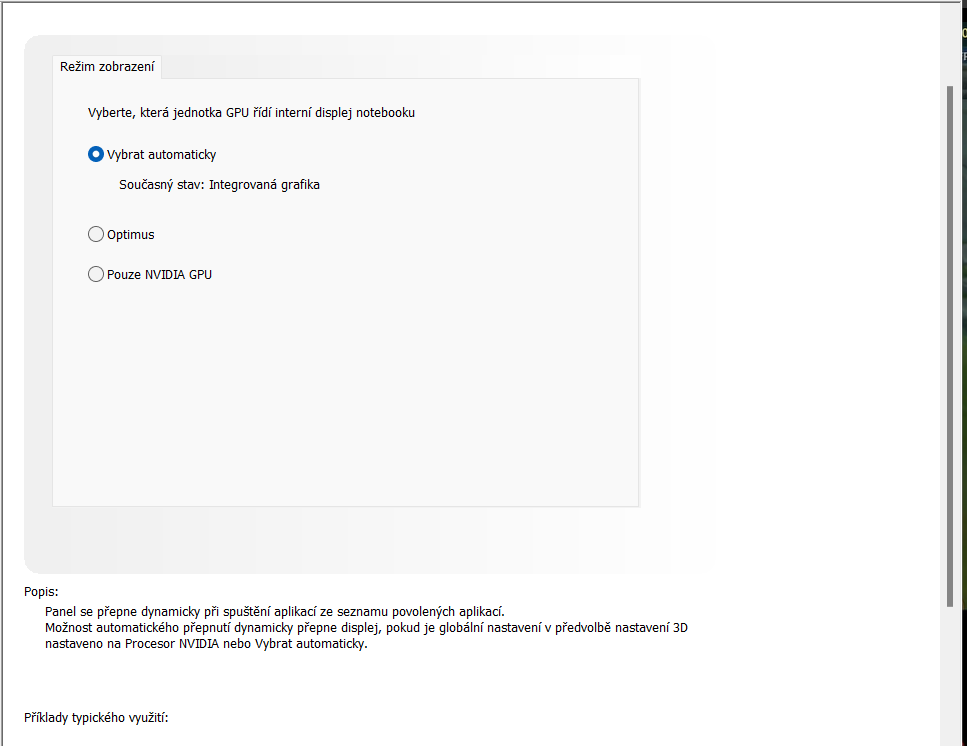 A když přepnu tady v tomhle jenom na "pouze nvidia GPU, tak to jede bez problému.